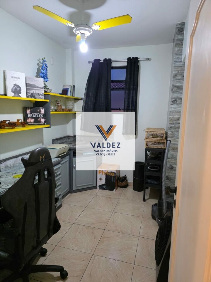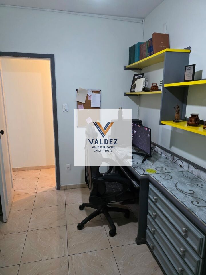 - sala grande com dois ambientes e cortinas na janela e área reservada para pequeno escritório, área de serviço com banheiro de empregada